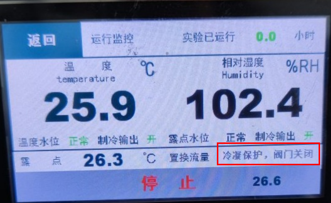 冷凝保護(hù),閥門關(guān)閉:是氣候箱為保護(hù)電子流量計(jì)設(shè)置的一種保護(hù)功能。當(dāng)露點(diǎn)水箱溫度高于15℃時(shí),閥門控制器關(guān)閉,高露點(diǎn)的水蒸氣無法通過閥門進(jìn)入電子流量計(jì),防止冷凝結(jié)露而損壞電子流量計(jì)。