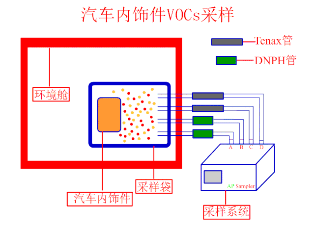 將待測部件放進一個無釋放、無污染的袋子,封口,放進一個環境艙中。該環境艙可模擬標準規定的不同的溫度、濕度和空氣置換率條件,用適當的方法分析氣體樣本,識別主要的污染物及其濃度隨時間的變化,然后根據測量的濃度確定汽車內飾件材料和產品的釋放率和釋放特性。