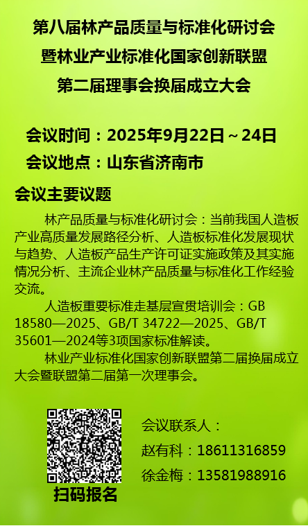 金秋送爽,泉韻悠揚。“第八屆林產品質量與標準化研討會暨林業產業標準化國家創新聯盟第二屆理事會換屆成立大會”將于2025922日~24日在山東濟南舉辦。